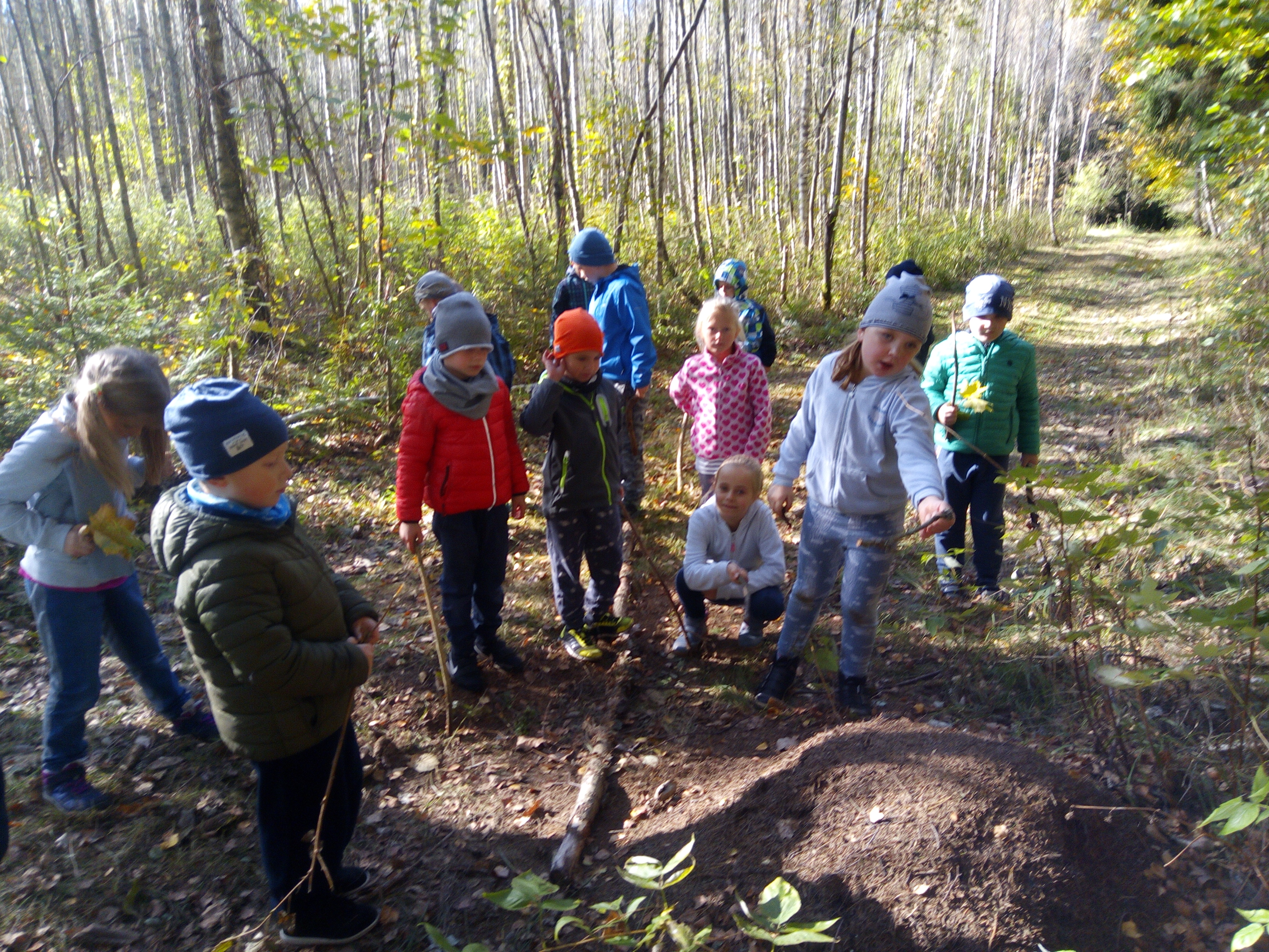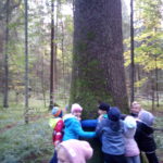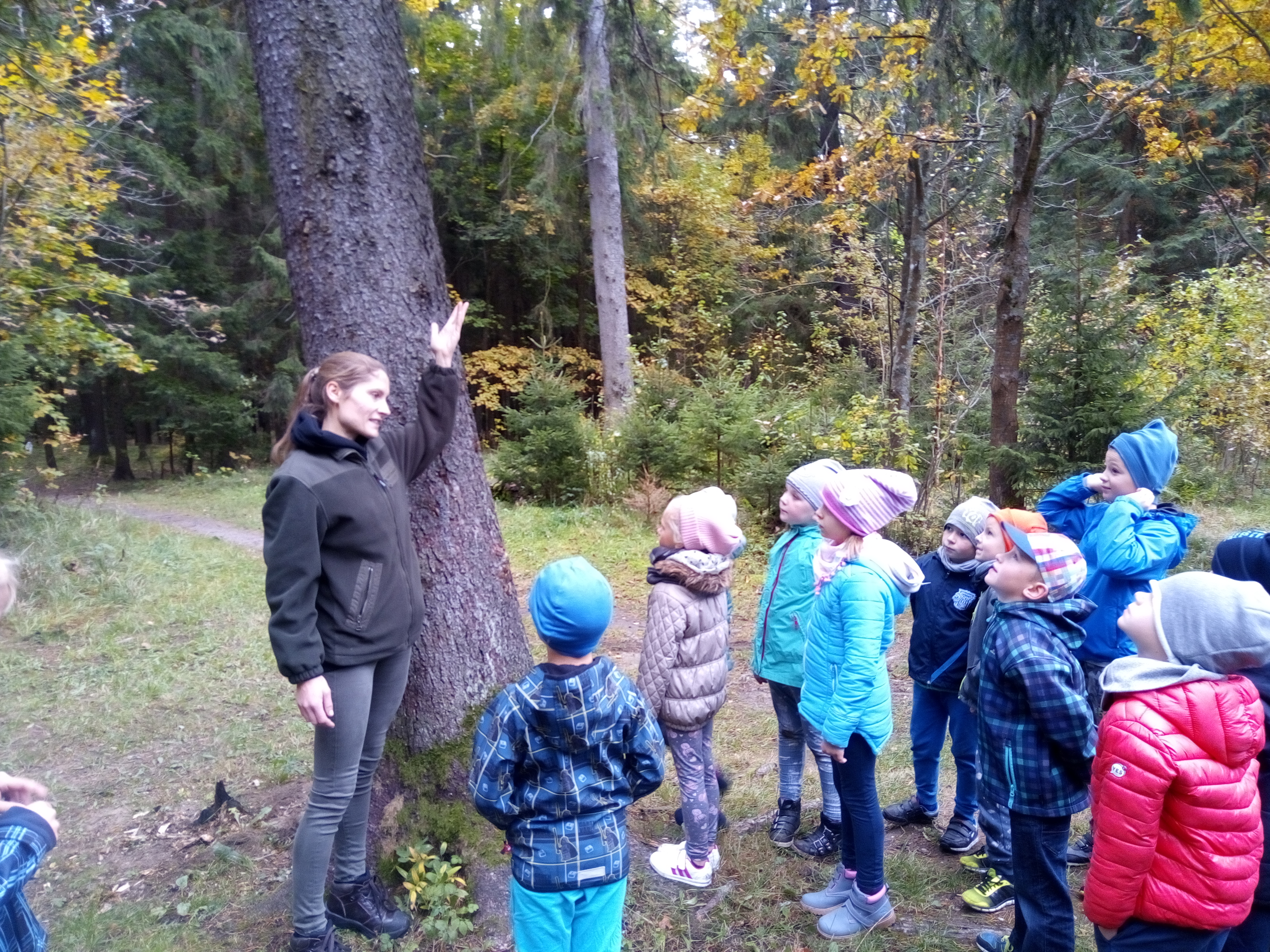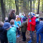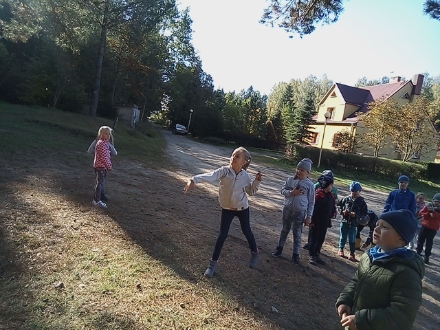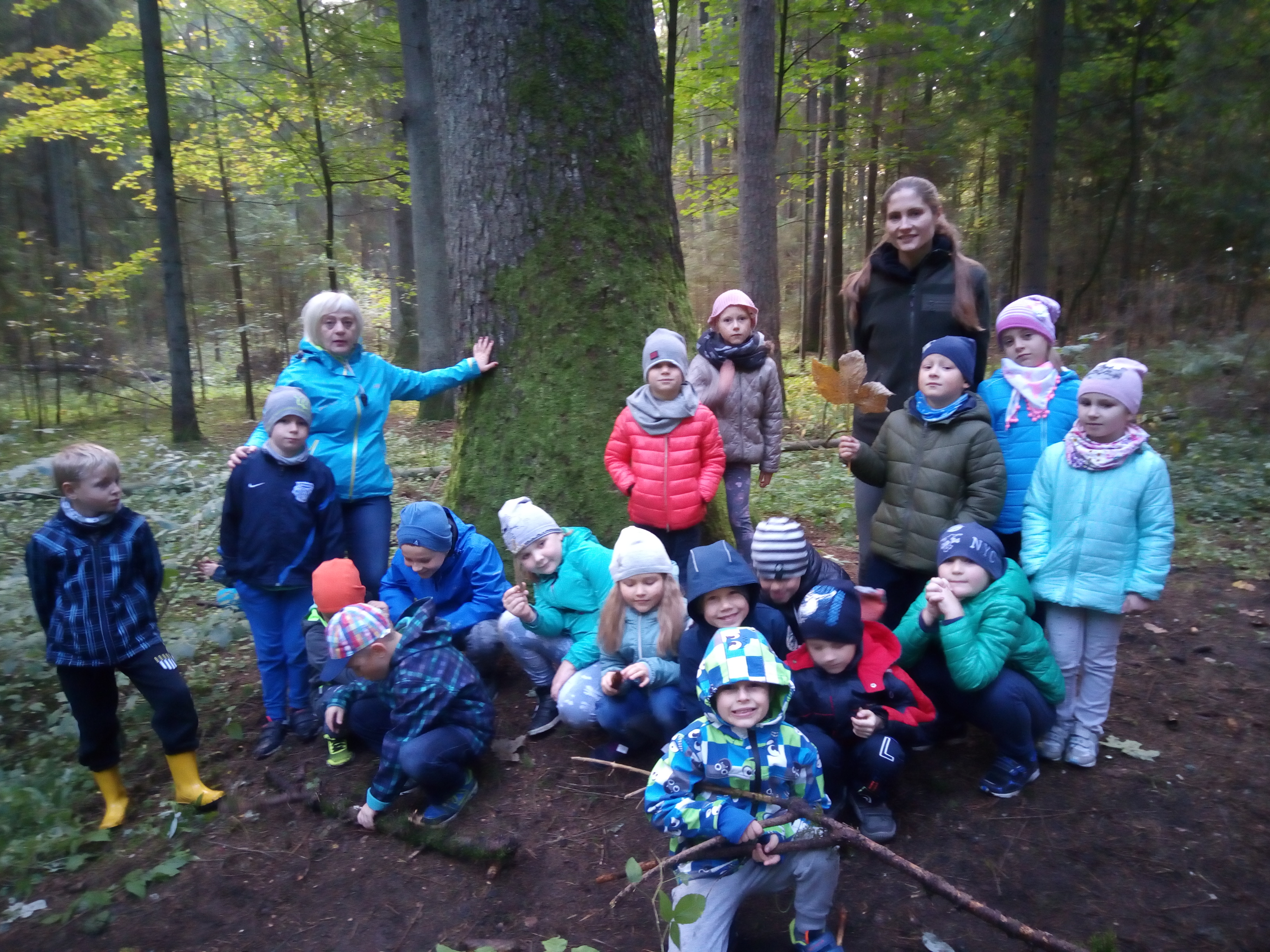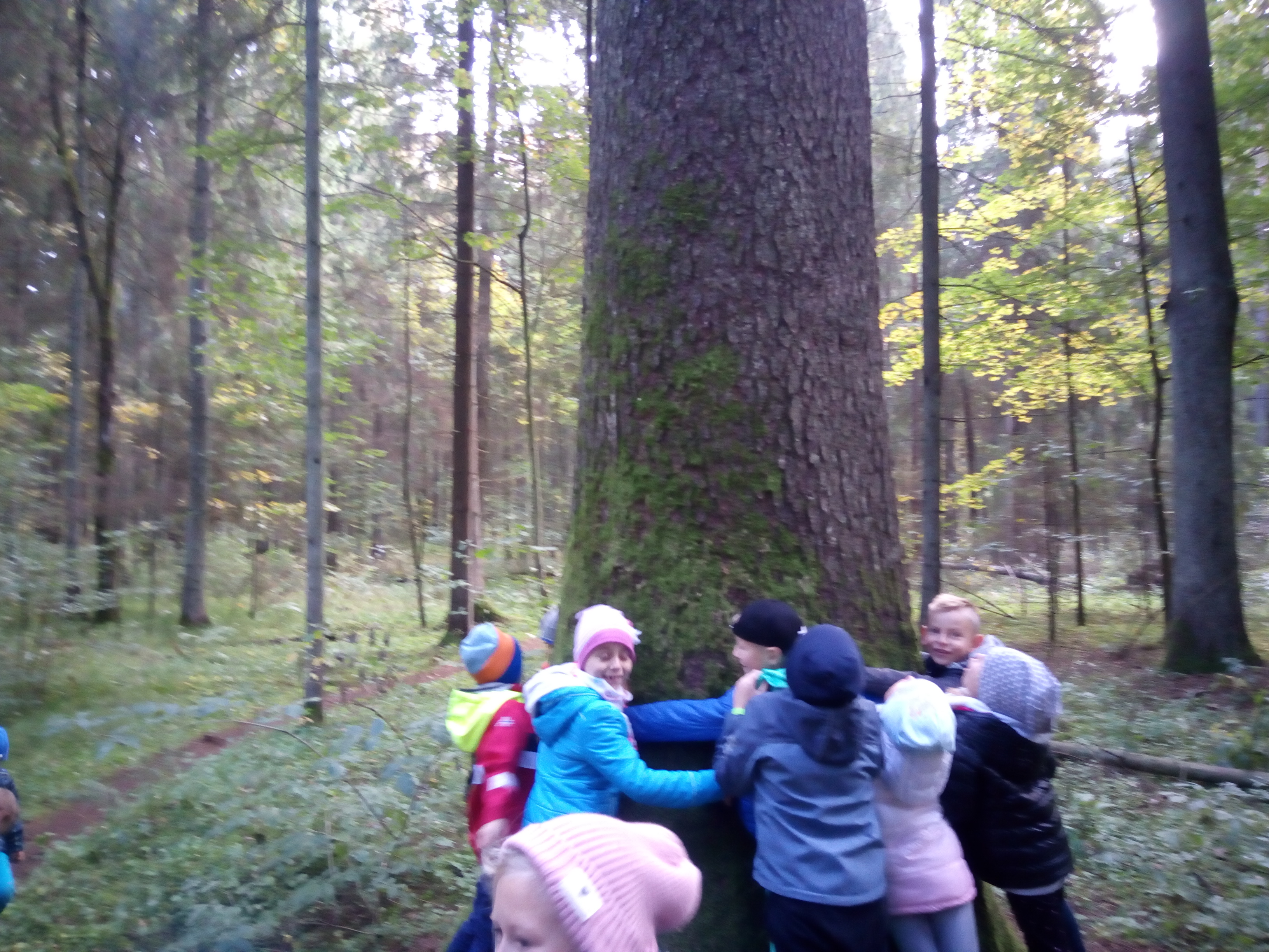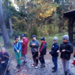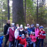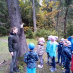 8 października 2018 r. klasy I c i II c z Jedynki pojechały na wycieczkę do lasu w ramach realizacji programu przyrodniczego „4 pory roku w lesie Kumiecie.” Las przywitał nas piękną, jesienną pogodą. Na polance czekała pani leśnik Agnieszka Iber z Nadleśnictwa Gołdap i zaprosiła uczniów na spacer. Dzieci obserwowały zmiany zachodzące w przyrodzie jesienią. Uczniowie z dużym zainteresowaniem słuchali, a następnie rozpoznawali rośliny zielne, krzewy i drzewa po liściach, nasionach i korze. Najciekawszym punktem wycieczki było spotkanie pod najstarszym drzewem – okazałym świerkiem, który ma około 200 lat. Ogłaszamy konkurs na imię dla tego drzewa. Dzieci słuchały odgłosów lasu. Spotkanie zakończyło się ogniskiem, pieczeniem kiełbasek i słodkim poczęstunkiem, który ufundował tatuś Piotrusia pan Daniel Jejer. Uczniowie zabrali „skarby lasu”: szyszki, listki, patyki i żołędzie.