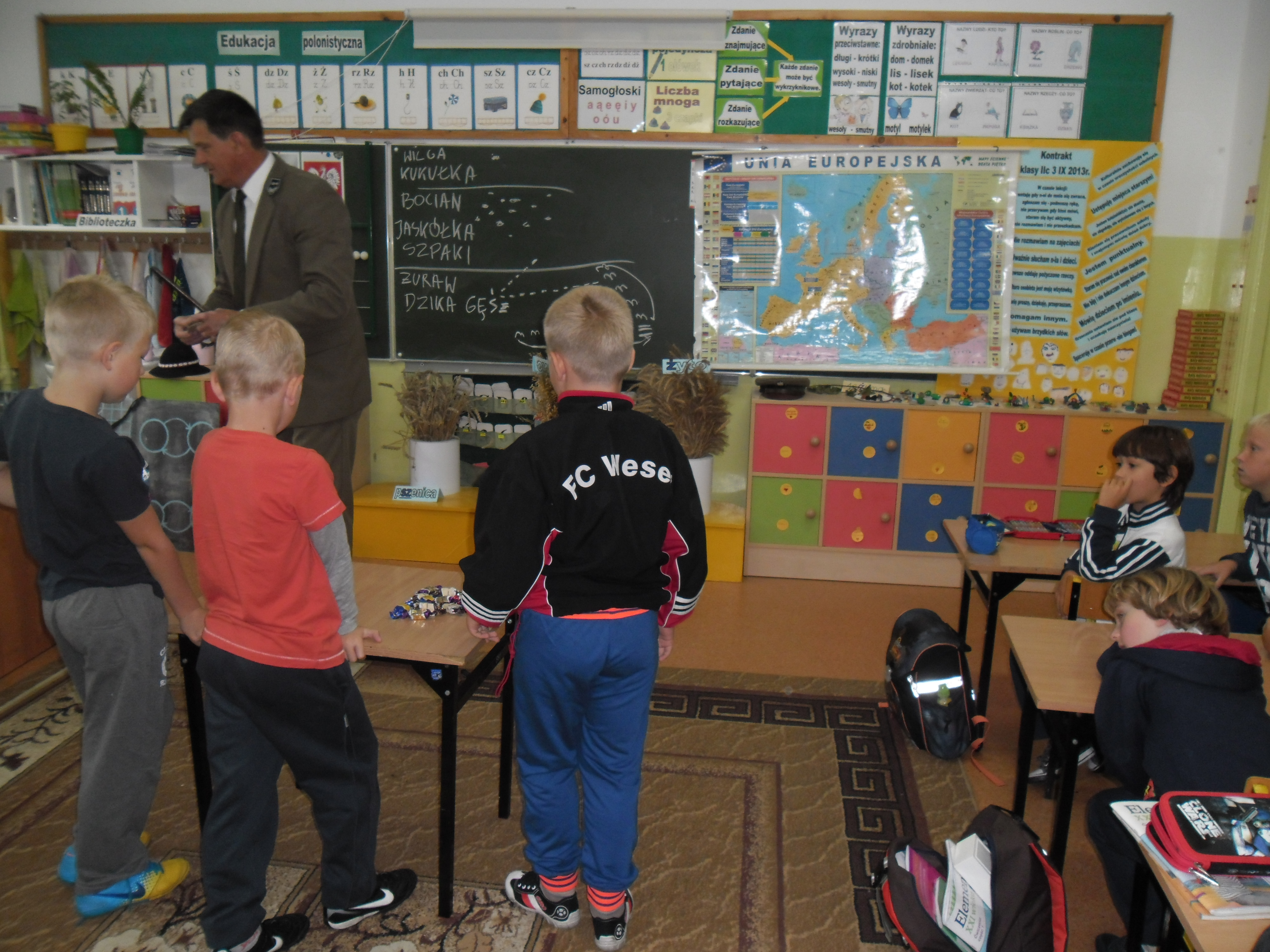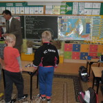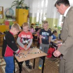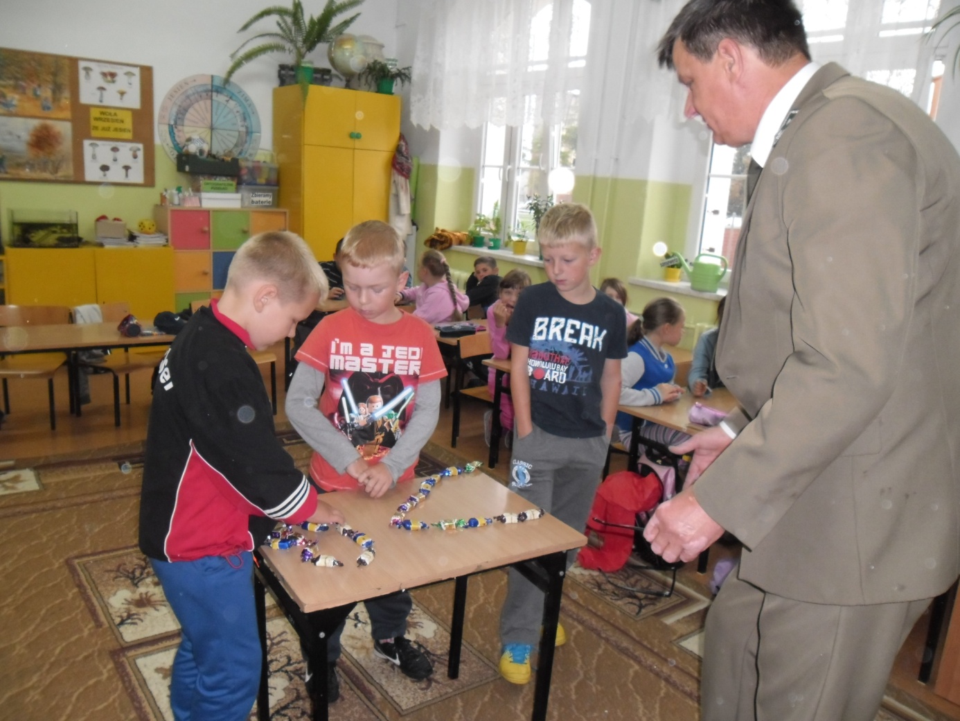12 IX 2013r. klasy IIa i IIc z SP nr 1 spotkały się z leśniczym z Nadleśnictwa Gołdap. Pan Henryk Bazylewicz z wielkim zaangażowaniem opowiadał o budowie i zwyczajach różnych gatunków ptaków, które na zimę odlatują z powodu braku możliwości zdobycia pokarmu oraz zmiany warunków atmosferycznych. Każdy gatunek ptaków charakteryzuje się innym okresem odlotu i sposobem zimowania. Zwrócił uwagę na to, że stada ptaków wzbijając się w powietrze tworzą formacje, które mają na celu ułatwić lot. Ptasie układy można podzielić na trzy: ptaki odlatują pojedynczo, stadami i kluczami. „Lecąc w układzie klucza tylko osobnik na czele narażony jest na największy opór powietrza. Natomiast ptaki za nim lecą w tzw. tunelu powietrznym z mniejszym oporem, dzięki czemu tracą mniej energii. Prowadzący wyprawę ptak nie doleciałby zbyt daleko, dlatego co pewien czas następuje zmiana lidera, zależności od poziomu zmęczenia poprzednika.” Uczniowie z wielkim zainteresowaniem słuchali opowiadania pana leśniczego. Na zakończenie układali słodkie formacje odlotów ptaków z cukierków. Uczniowie, którzy wykazali się bogatą wiedzą otrzymali znaczki i naklejki z ptakami. Serdecznie dziękujemy panu leśniczemu za wyjątkowo ciekawe zajęcia.