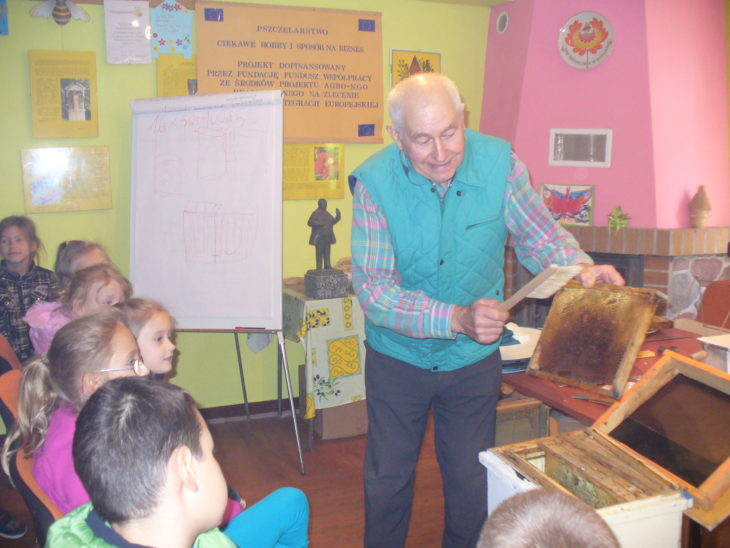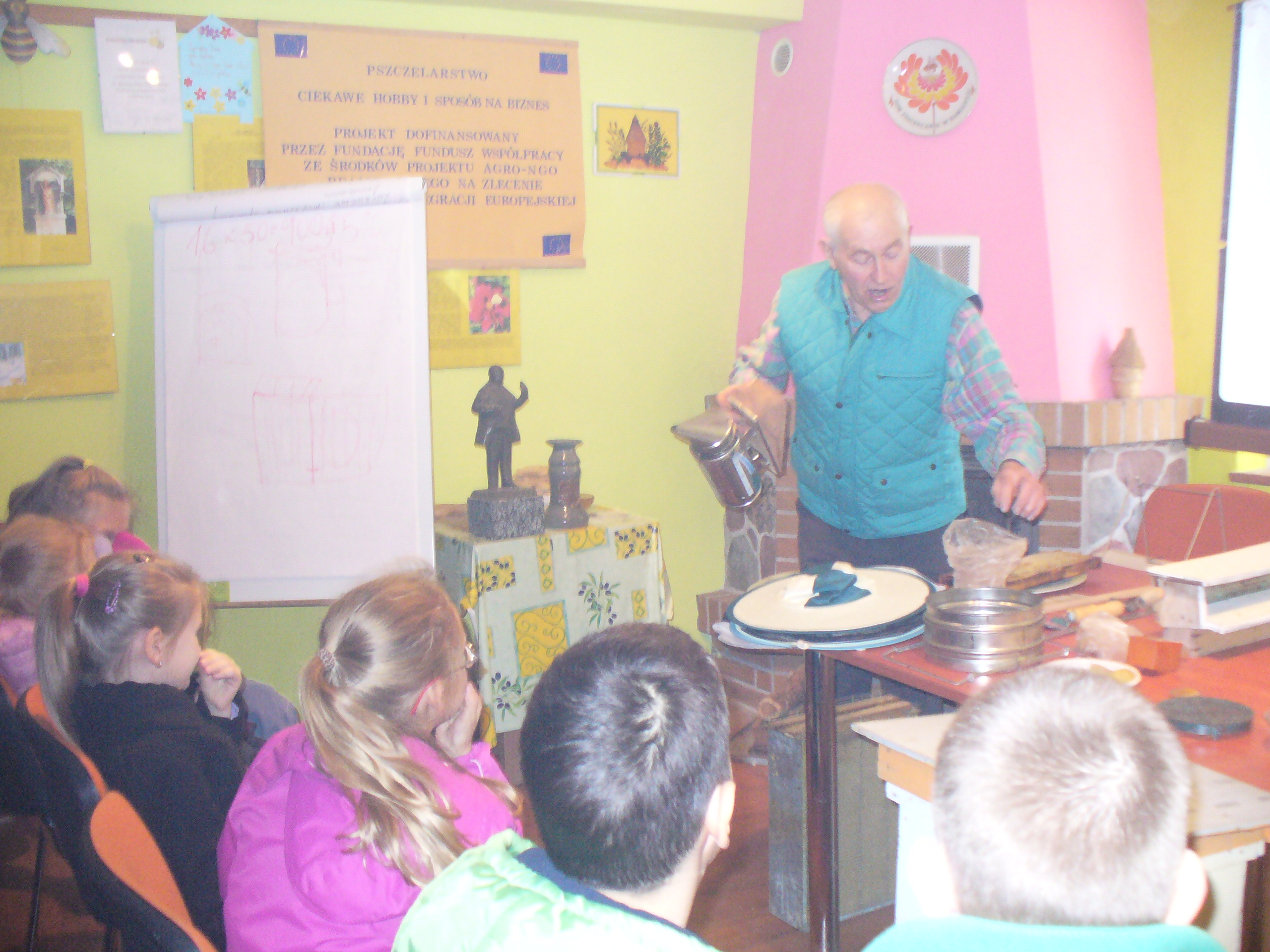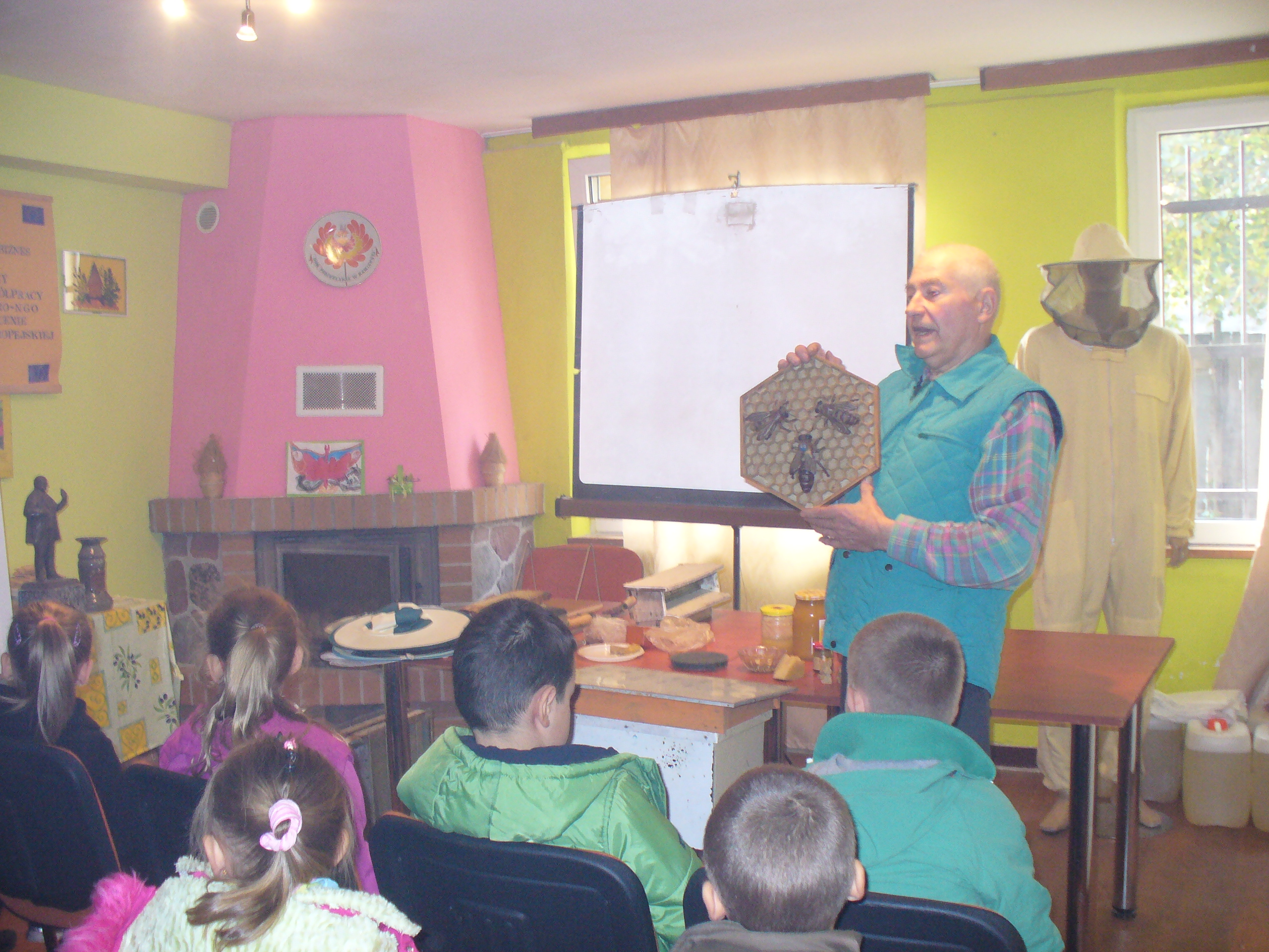 Uczniowie z SP1 gościli w siedzibie Gołdapskiego Stowarzyszenia Pszczelarzy. O życiu pszczół, roślinach miododajnych i pracy pszczelarzy w interesujący sposób opowiadał p. Józef Giełażys, zastępca prezesa GSP. Dzieci mogły obejrzeć ul z ramkami i plastrami, odzież i sprzęt pasieczny. Poznały produkty pszczele – pyłek pszczeli, wosk pszczeli, propolis. Na zakończenie zajęć zaproszono gości na słodki poczęstunek – wafle z miodem i ziarenka pyłku.